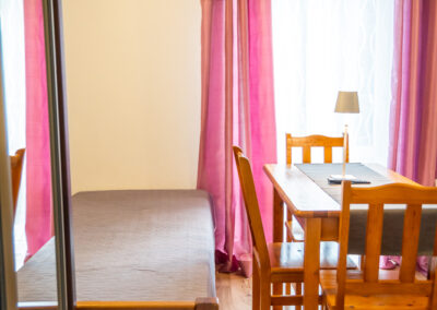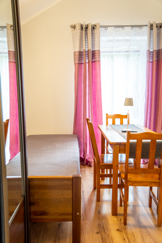 Każdy z naszych pokoi wyposażony jest w aneks kuchenny, w którym znajduje się: czajnik elektryczny, kuchenka mikrofalowa, lodówko-zamrażarka, naczynia, sztućce, płyn, ściereczki.
