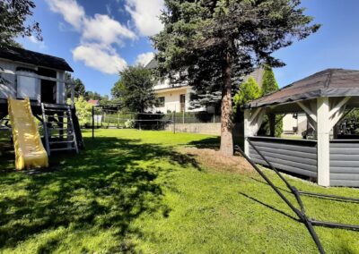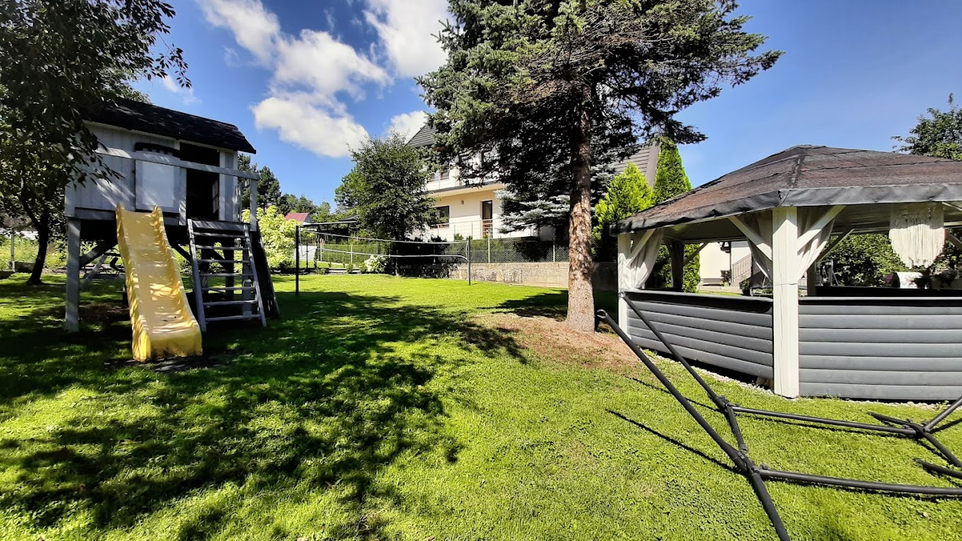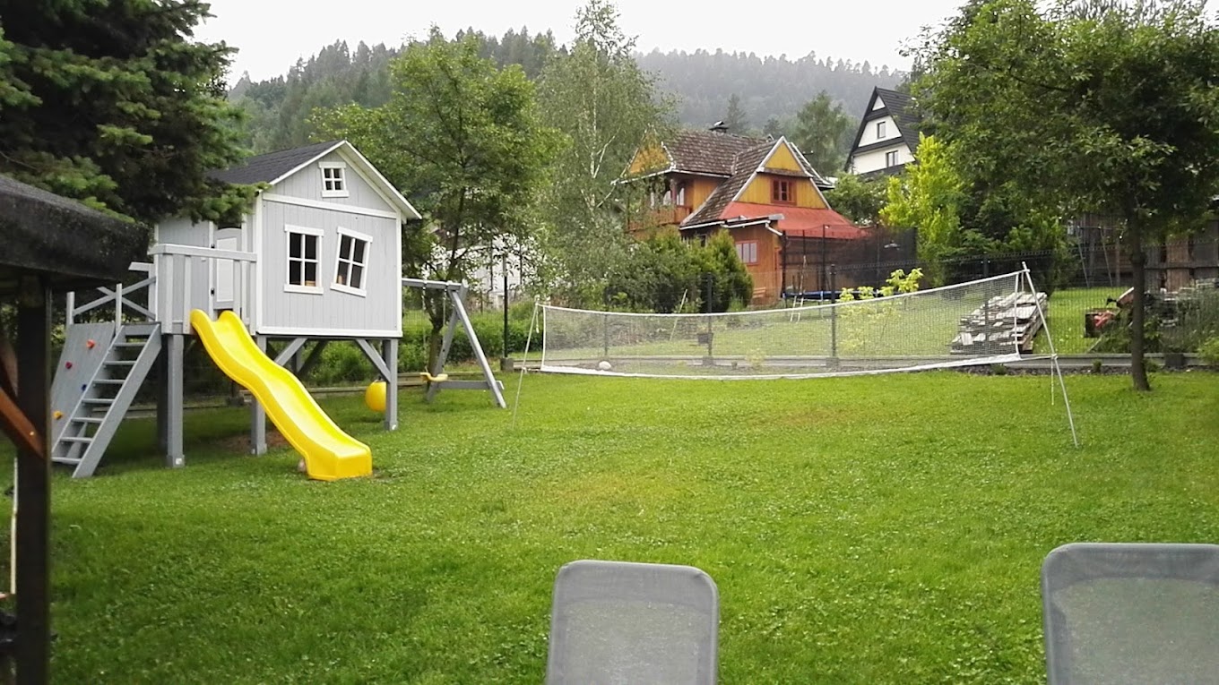 duuuuużą trampolinę, piaskownicę i zabawki, zjeżdżalnię, huśtawkę, plac do gry w piłkę lub badmintona